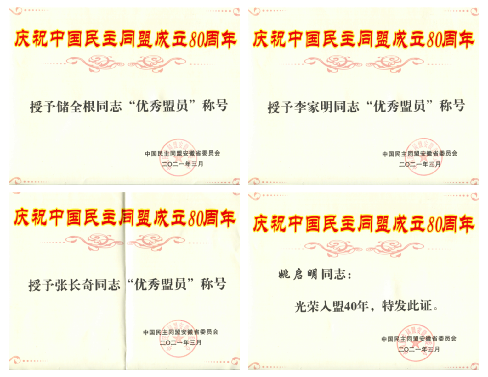 本次会议上,表彰了庆祝中国民主同盟成立80周年先进集体和优秀盟员,我校民盟总支获“庆祝中国民主同盟成立80周年先进集体”表彰,这是继民盟成立70周年获表彰后再次获此殊荣。总支主委储全根教授、副主委李家明教授、组织委员张长奇主任医师获“优秀盟员”表彰。会上还对入盟40年以上的老盟员发放了证书,我校原针灸推拿学院副教授姚启明老师获此殊荣。